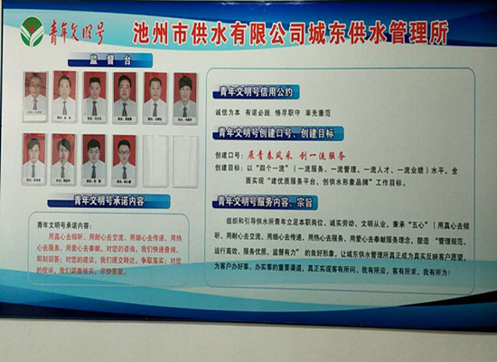 池州市供水公司城東所是集收費(fèi)、抄表、維修等服務(wù)為一體的供水管理所,現(xiàn)有職工12名,平均年齡32歲,是供水戰(zhàn)線上一支特別能吃苦、能戰(zhàn)斗、能奉獻(xiàn)的青年集體。近年來(lái),城東供水管理所始終把創(chuàng)建“青年文明號(hào)”活動(dòng)作為凝聚青年、團(tuán)結(jié)青年、帶領(lǐng)青年建功立業(yè)的有效形式,緊密結(jié)合供水工作特點(diǎn),以倡導(dǎo)職業(yè)文明為核心,以規(guī)范文明、立足本職、自我監(jiān)控、敬業(yè)守信、無(wú)私奉獻(xiàn)為理念,確定了建立“學(xué)習(xí)型”“奉獻(xiàn)型”青年文明號(hào)的創(chuàng)建之路。