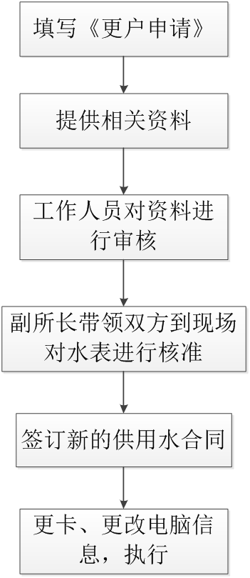 2、用戶將相關(guān)材料準(zhǔn)備妥當(dāng)之后向工作人員遞交,相關(guān)工作人員負(fù)責(zé)對(duì)遞交材料進(jìn)行審核,同時(shí)聯(lián)系用戶所在轄區(qū)的供水所副所長(zhǎng)。副所長(zhǎng)接到指令,在五個(gè)工作日之內(nèi)與用戶雙方(賣方與買方)到現(xiàn)場(chǎng)對(duì)相關(guān)水表底度進(jìn)行核準(zhǔn),如發(fā)現(xiàn)問(wèn)題,應(yīng)當(dāng)面向買賣雙方指出,并聯(lián)系材料審核人員錄入新的底度。用戶不