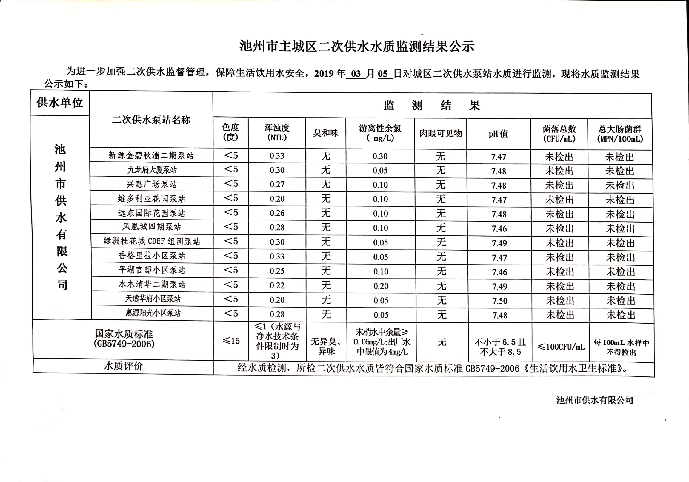 池州市主城區(qū)二次供水水質(zhì)監(jiān)測(cè)結(jié)果公示(2019.04.12) | |
