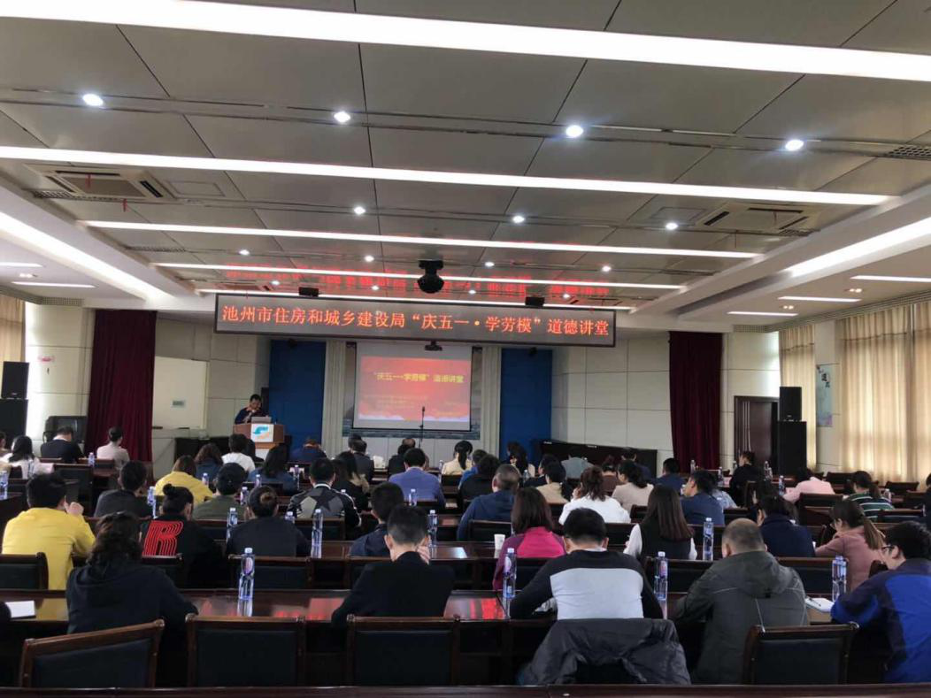 弘揚勞模精神勞動精神、工匠精神,營造學習典型、創(chuàng)先爭優(yōu)的濃厚氛圍4月26日下午,市住房和城鄉(xiāng)建設局機關黨委、市建設建材工會主辦、市供水有限公司承辦了以“慶五一·學勞模為主題的道德講堂活動。池州市住房和城鄉(xiāng)建設局黨組副書記、副局長余祖平、總工會調研員趙桂萍、市文明辦副調研員王家才市建設建材工會主席方學松出席活動,局管、局屬各單位黨員代表、團員代表和基層工會職工代表以及房地產、建筑行業(yè)企業(yè)代表共計80余人參加了本次活動。
