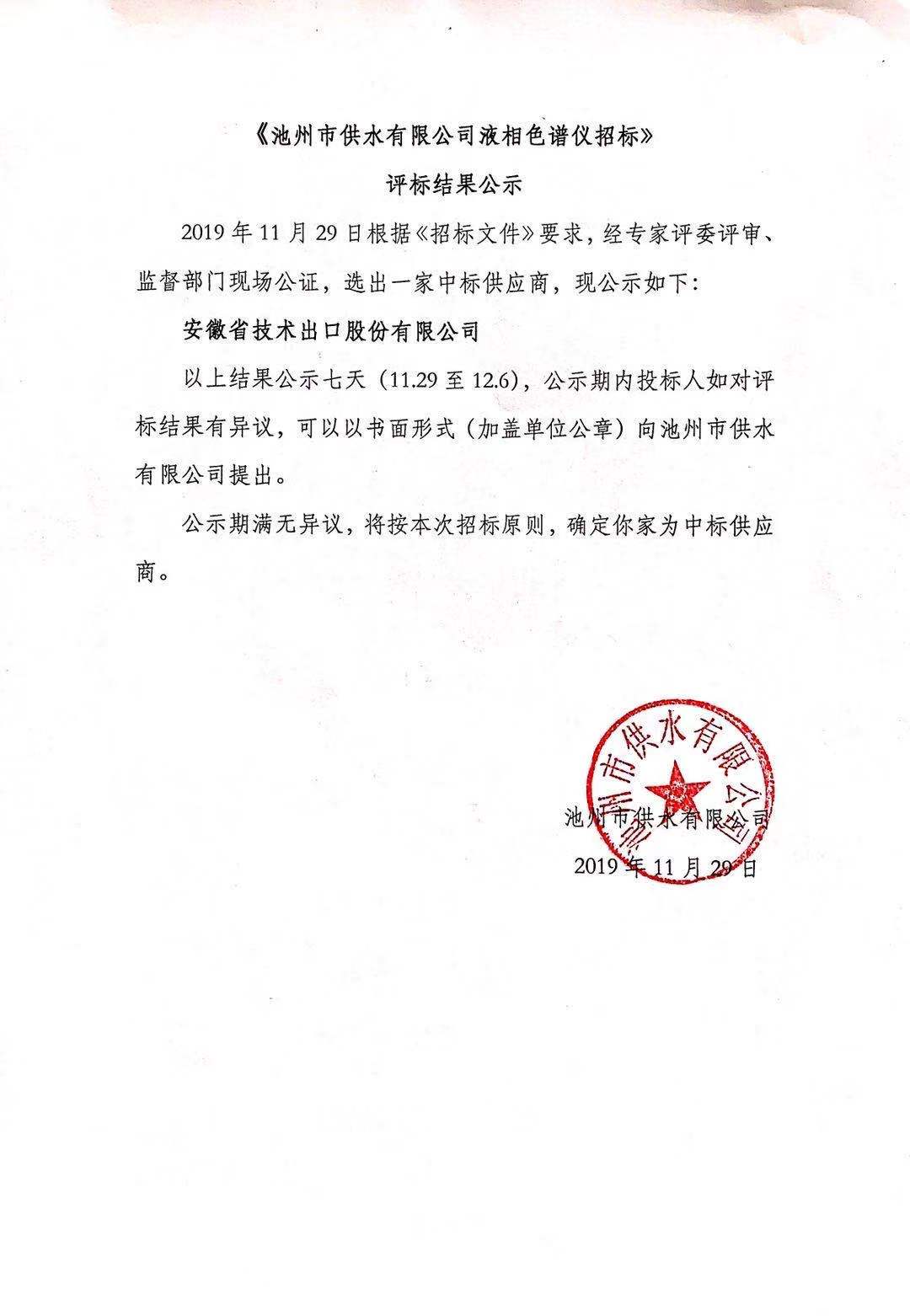 《池州市供水有限公司液相色譜儀招標》評標結果公示 | |