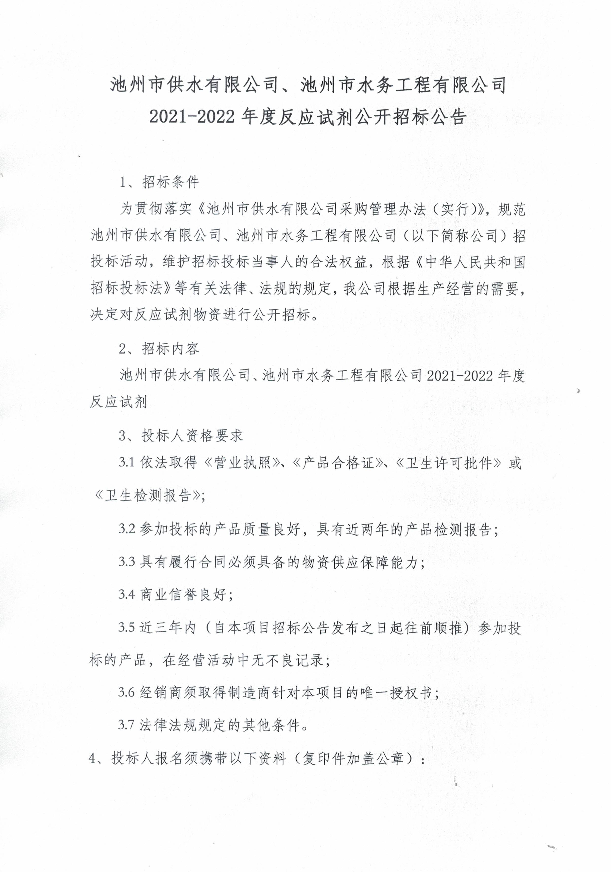 池州市供水有限公司、池州市水務(wù)工程有限公司2021-2022年度反應(yīng)試劑公開招標(biāo)公告 | |