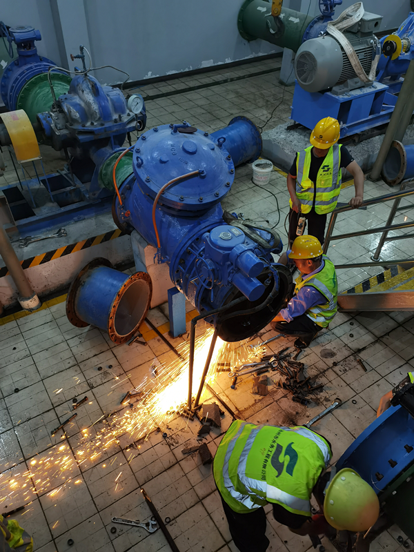 在實施機組改造前,公司提前通過各類媒介廣而告之施工期間的降壓供水,并要求工程人員提前做好各類準(zhǔn)備工作。5月28日晚11點半,隨著江口水廠廠長丁益“停止供水,開始施工”的一聲令下,值班班組人員立即按下機組的暫停鍵,往常“轟鳴”的水廠仿佛一下就進入無聲的睡眠中,同時各施工人員紛紛拿起扳手、翹桿、焊具等施工器具開始作業(yè)。他們有的兩兩合作卸下螺絲、有的開啟起重裝置吊運閥門、有的利用切割器具切割鋼管,工作有條不紊的開展著。 經(jīng)過2個多小時的全力奮戰(zhàn),原有機組設(shè)備全部安全拆除。緊接著,施工人員開始焊接新管道,清理設(shè)備密封部位,將供水泵與管道成功連接。