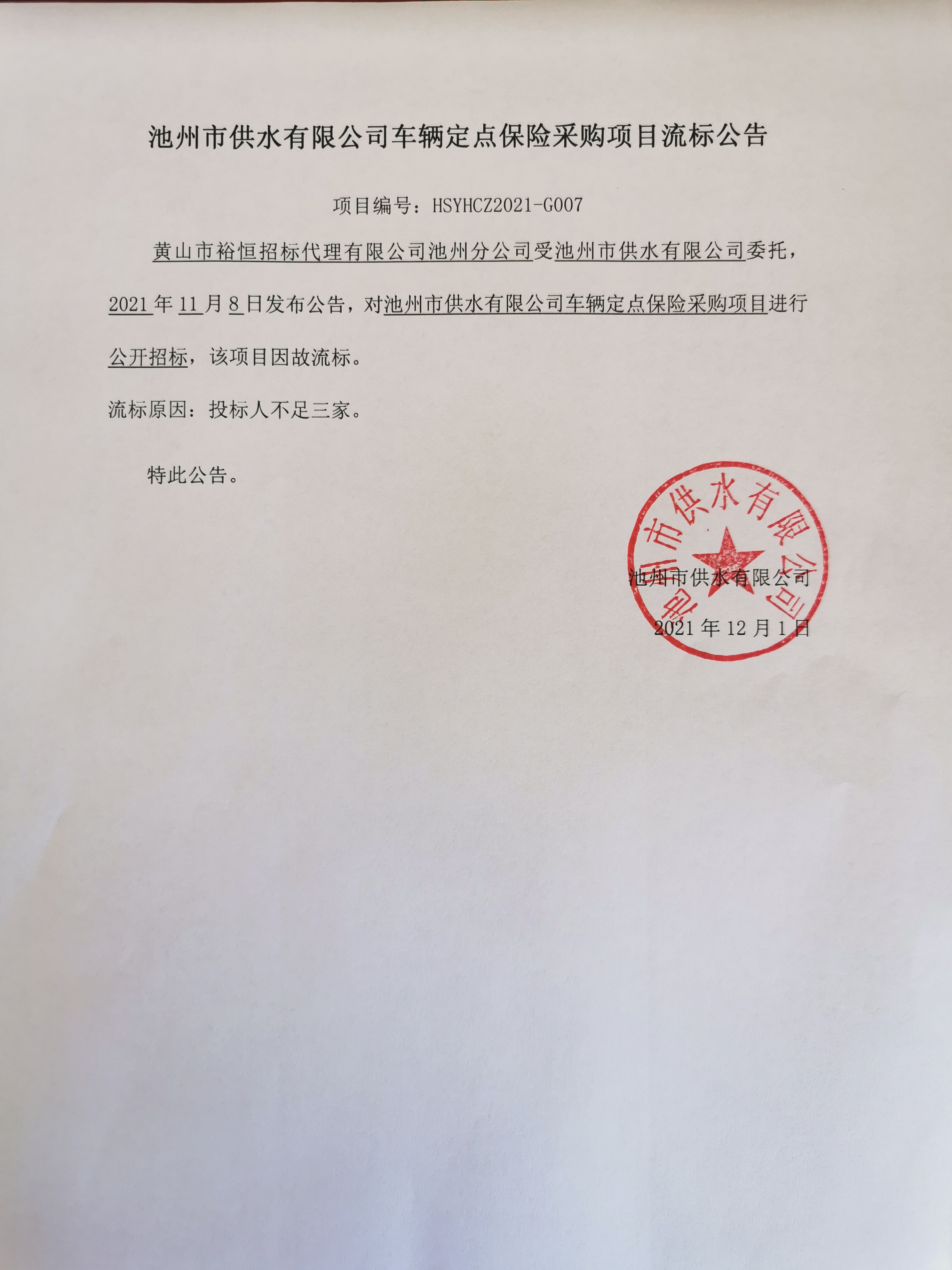 池州市供水有限公司車輛定點(diǎn)保險(xiǎn)采購項(xiàng)目流標(biāo)公告 | |