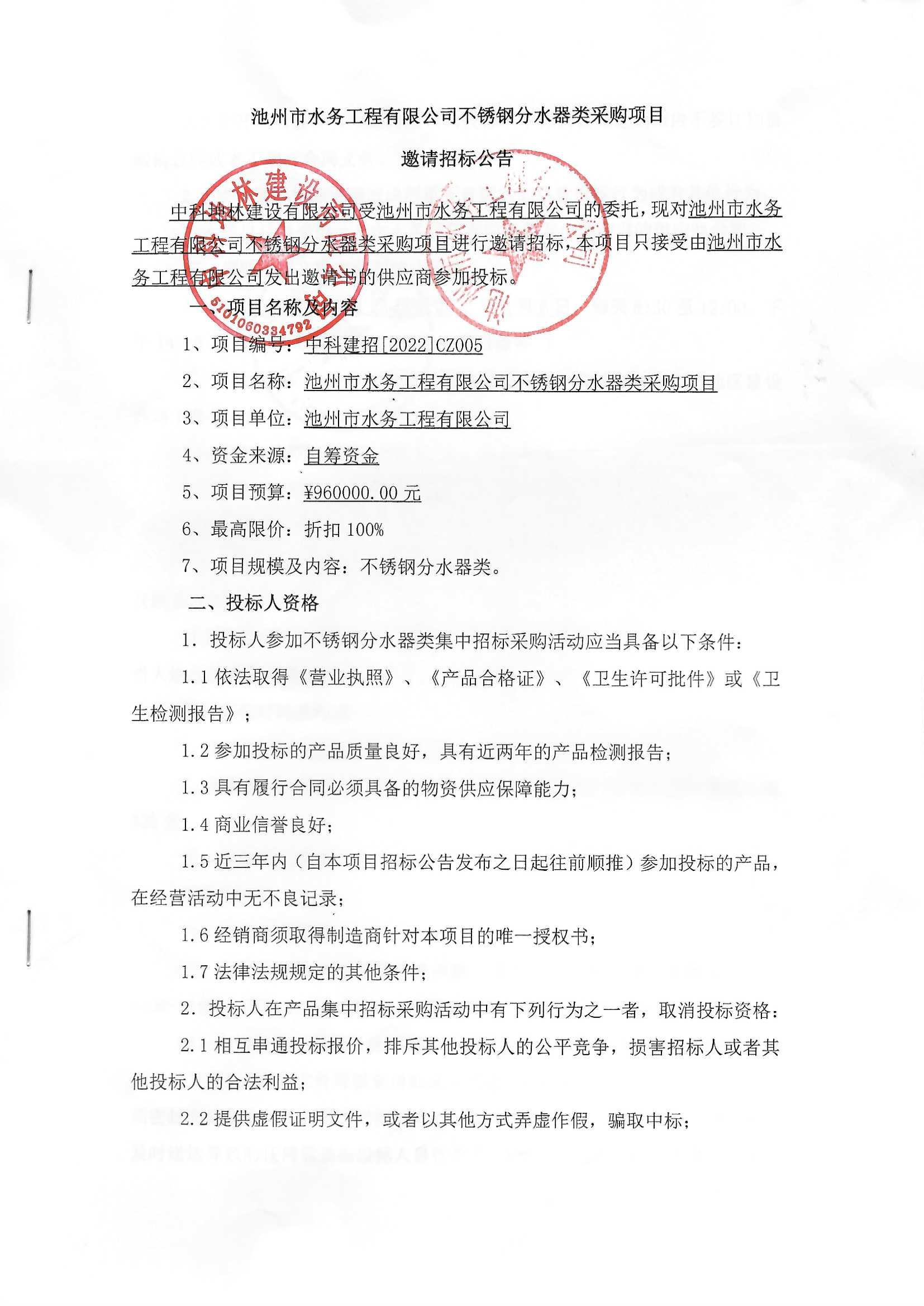 池州市水務(wù)工程有限公司不銹鋼分水器類采購項目邀請招標(biāo)公告 | |