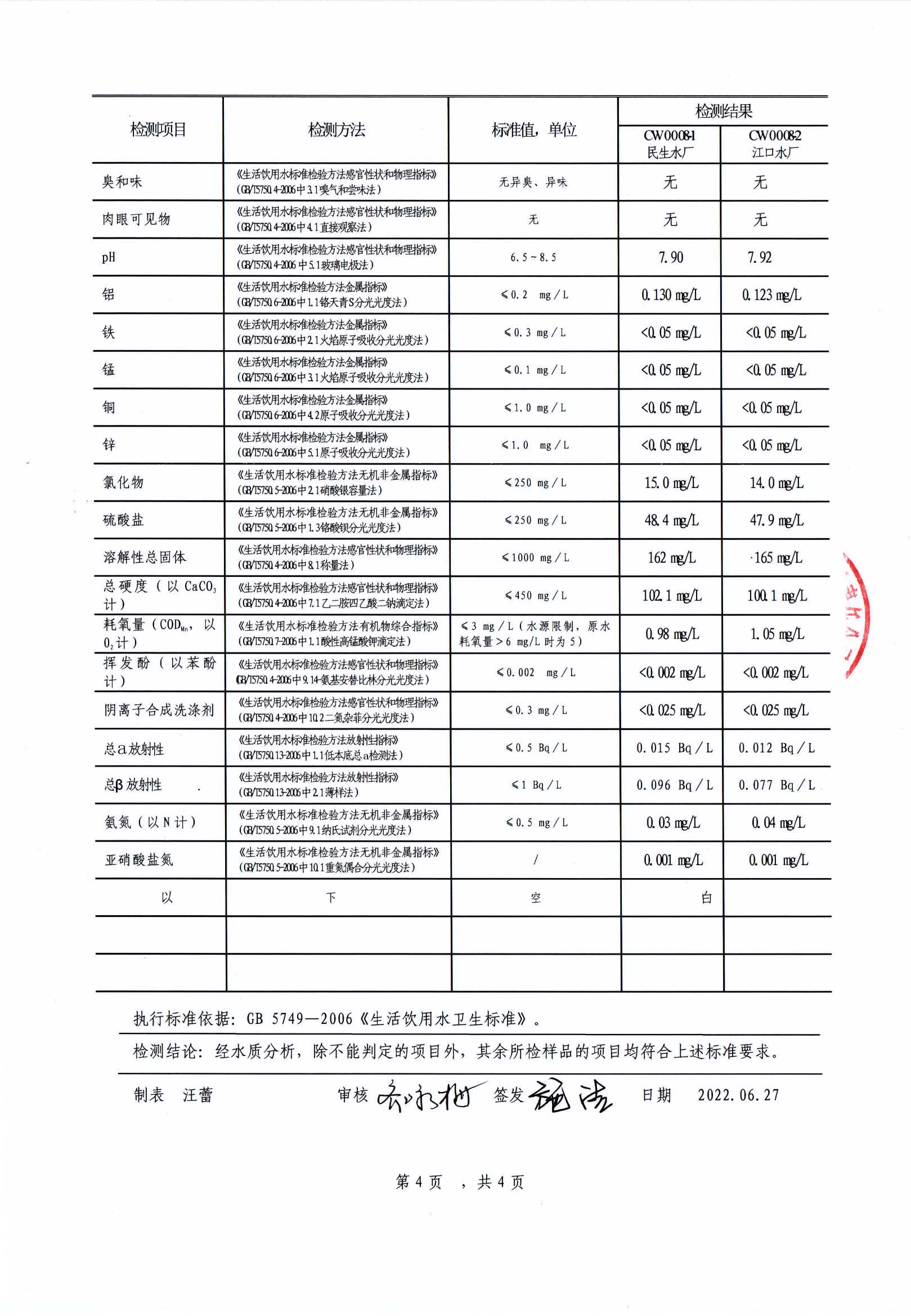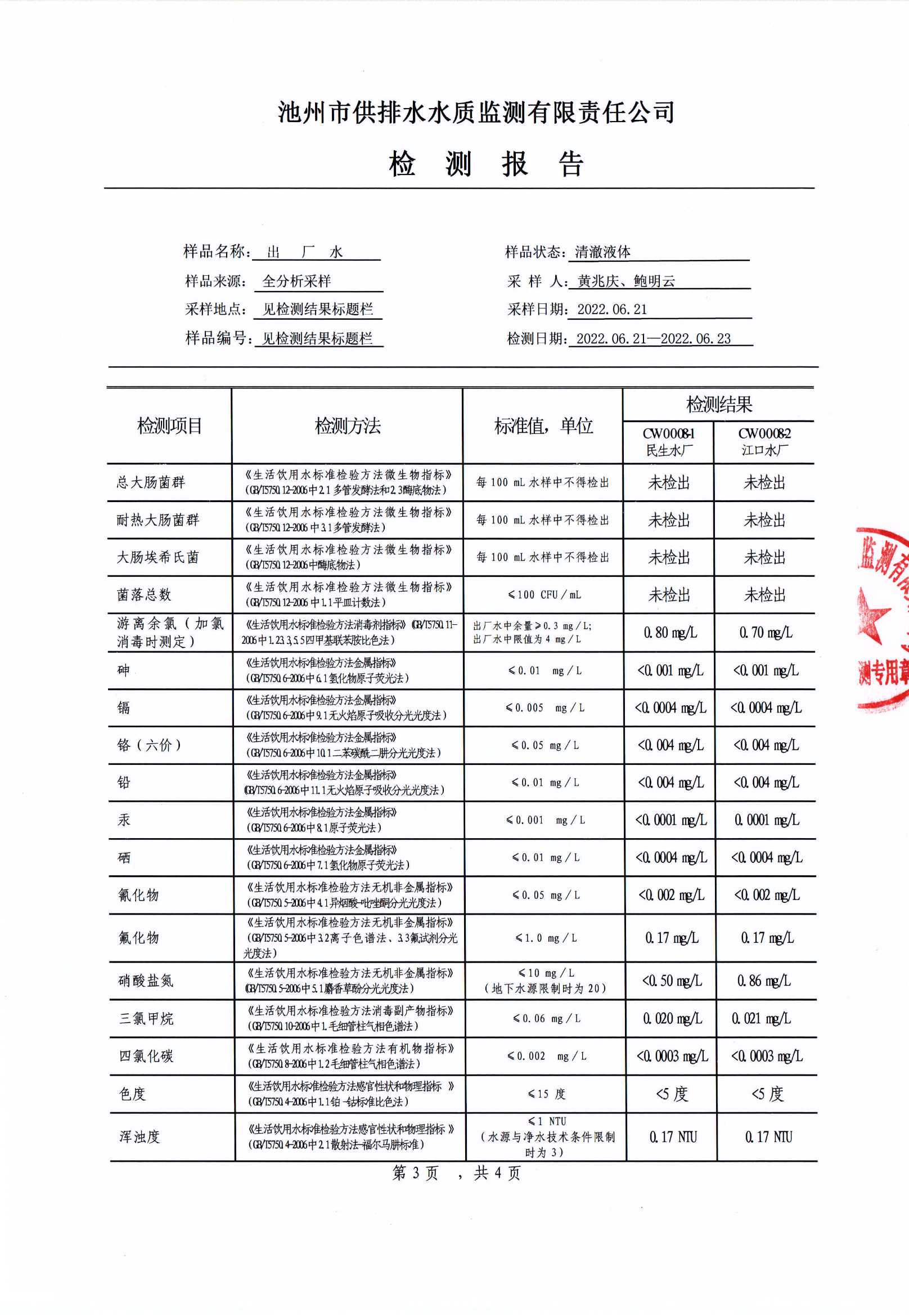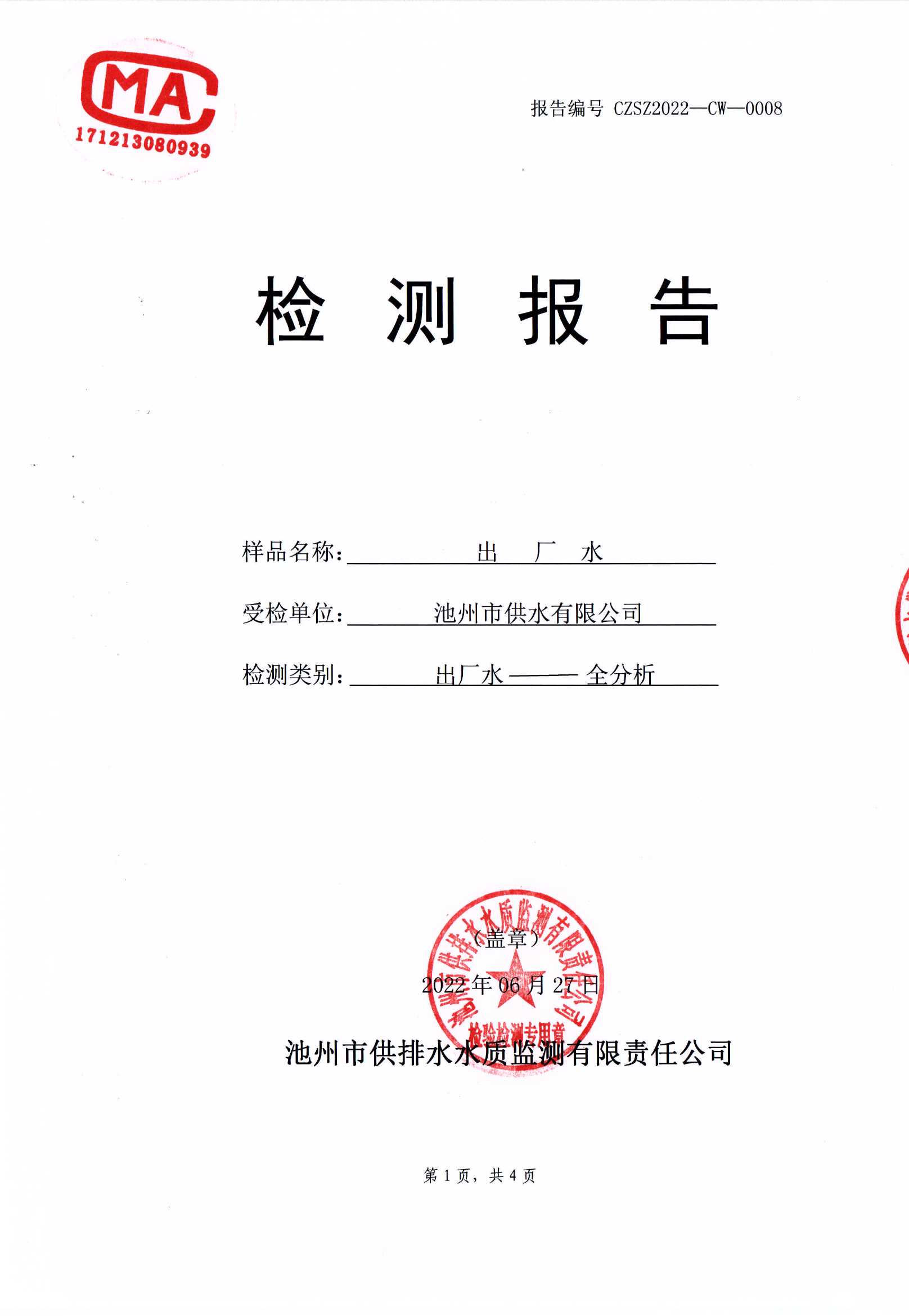 池州市供水有限公司出廠水(全分析)檢測(cè)報(bào)告(2022.07.14) | |