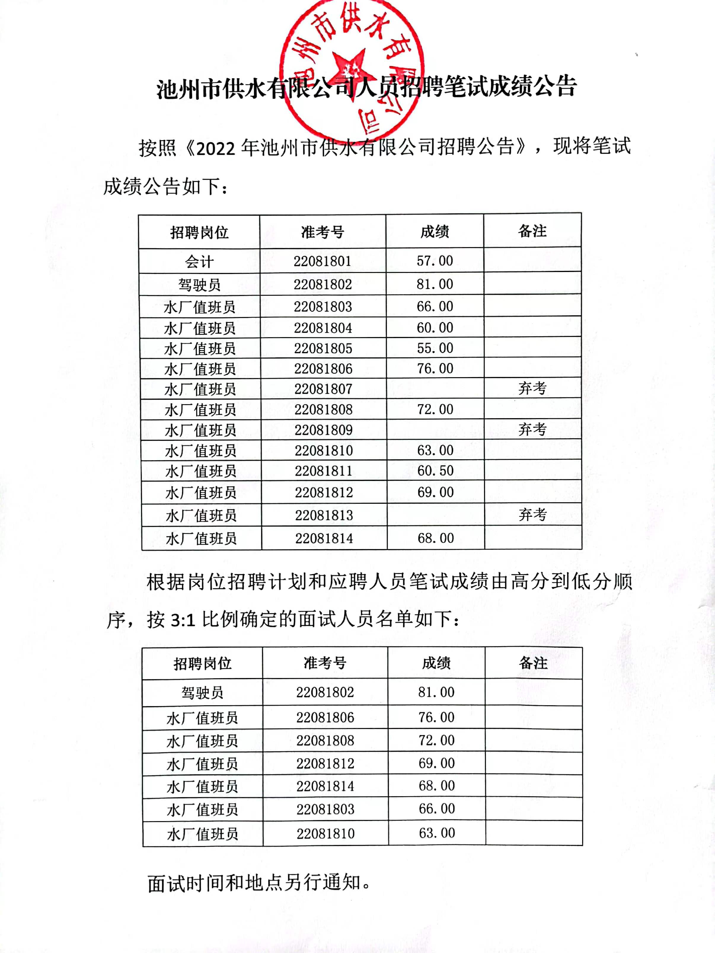 池州市供水有限公司人員招聘筆試成績(jī)公告 | |