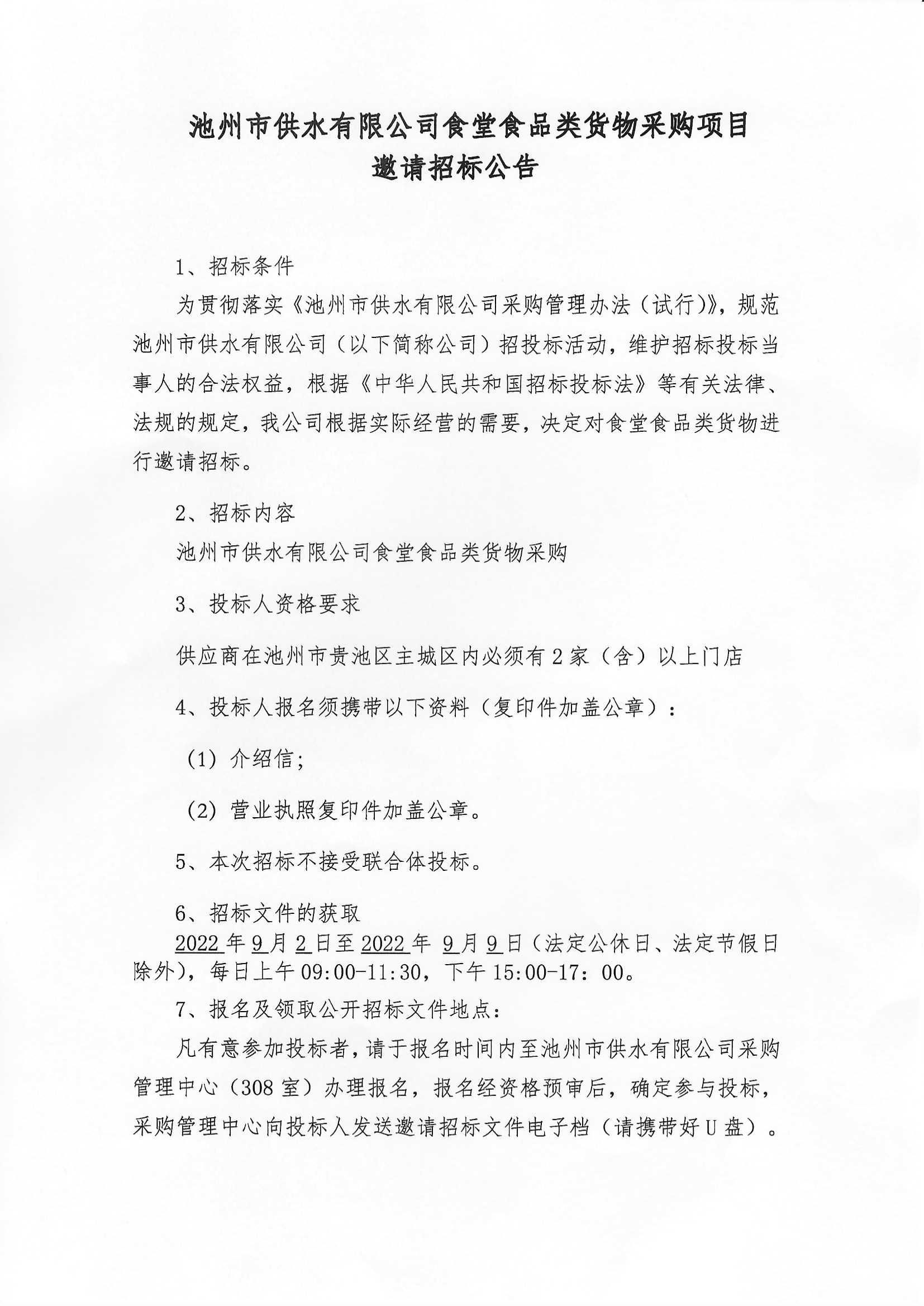 池州供水公司食堂食品類貨物采購(gòu)項(xiàng)目邀請(qǐng)招標(biāo)公告 | |