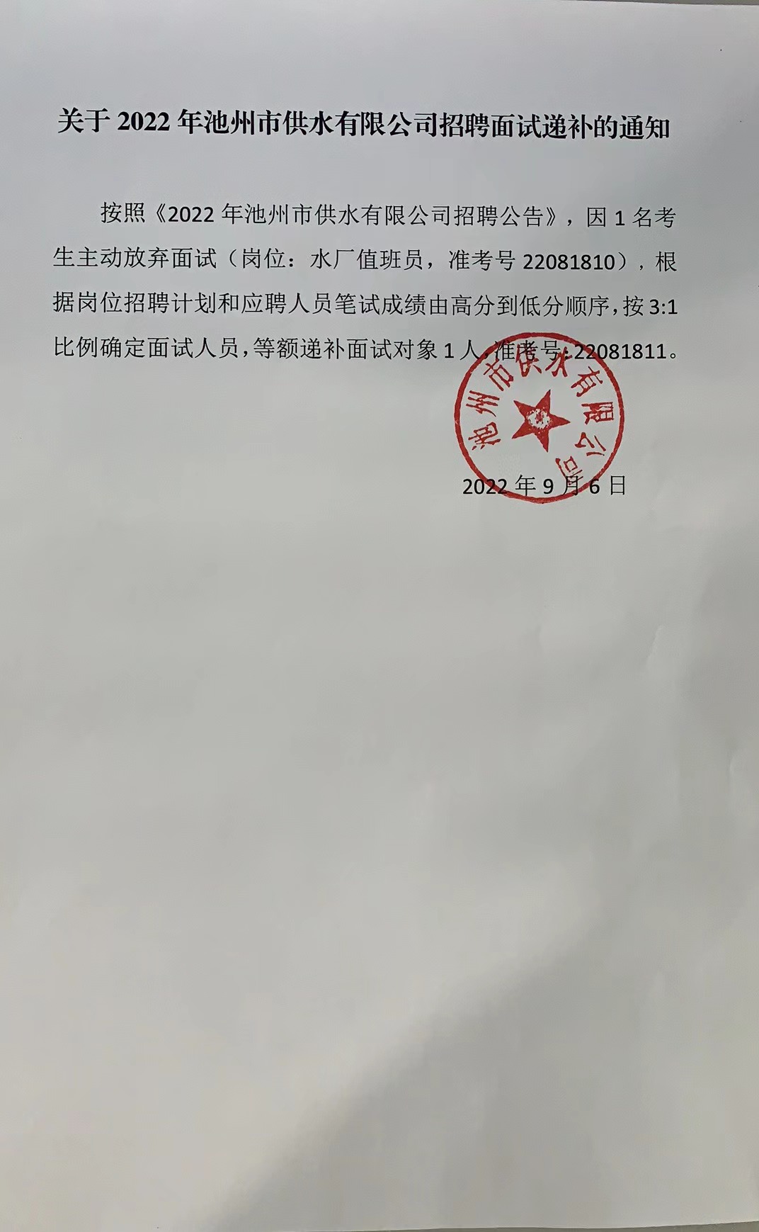 關(guān)于2022年池州市供水有限公司招聘面試遞補的通知 | |