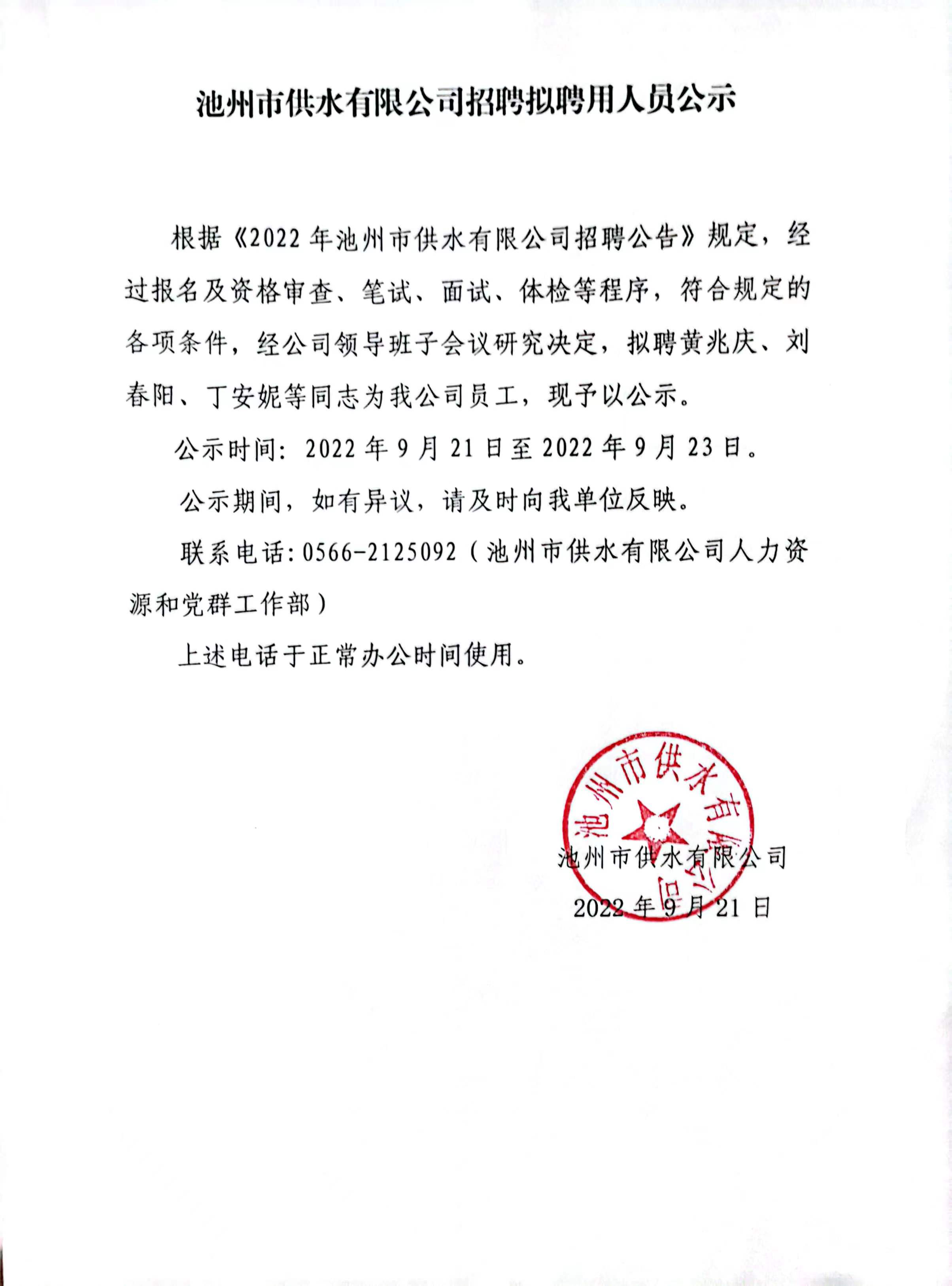 池州市供水有限公司招聘擬聘用人員公示 | |