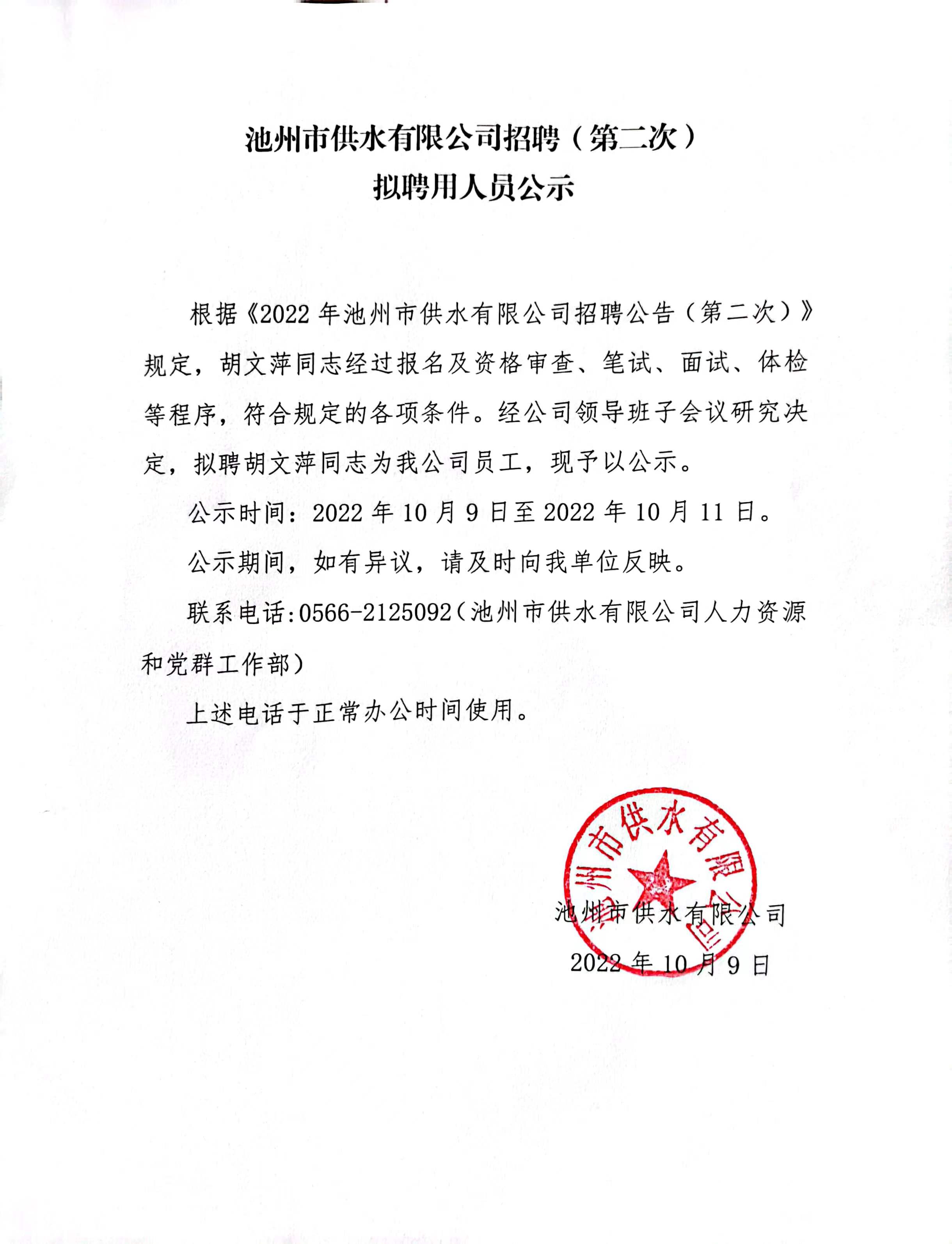 池州市供水有限公司招聘(第二次)擬聘用人員公示 | |