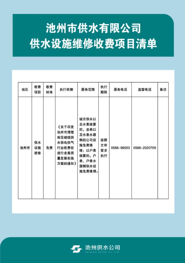 池州市供水有限公司供水設(shè)施維修項(xiàng)目收費(fèi)清單 | |
