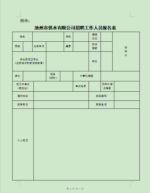 附件:2023年池州市供水有限公司招聘工作人員報名表