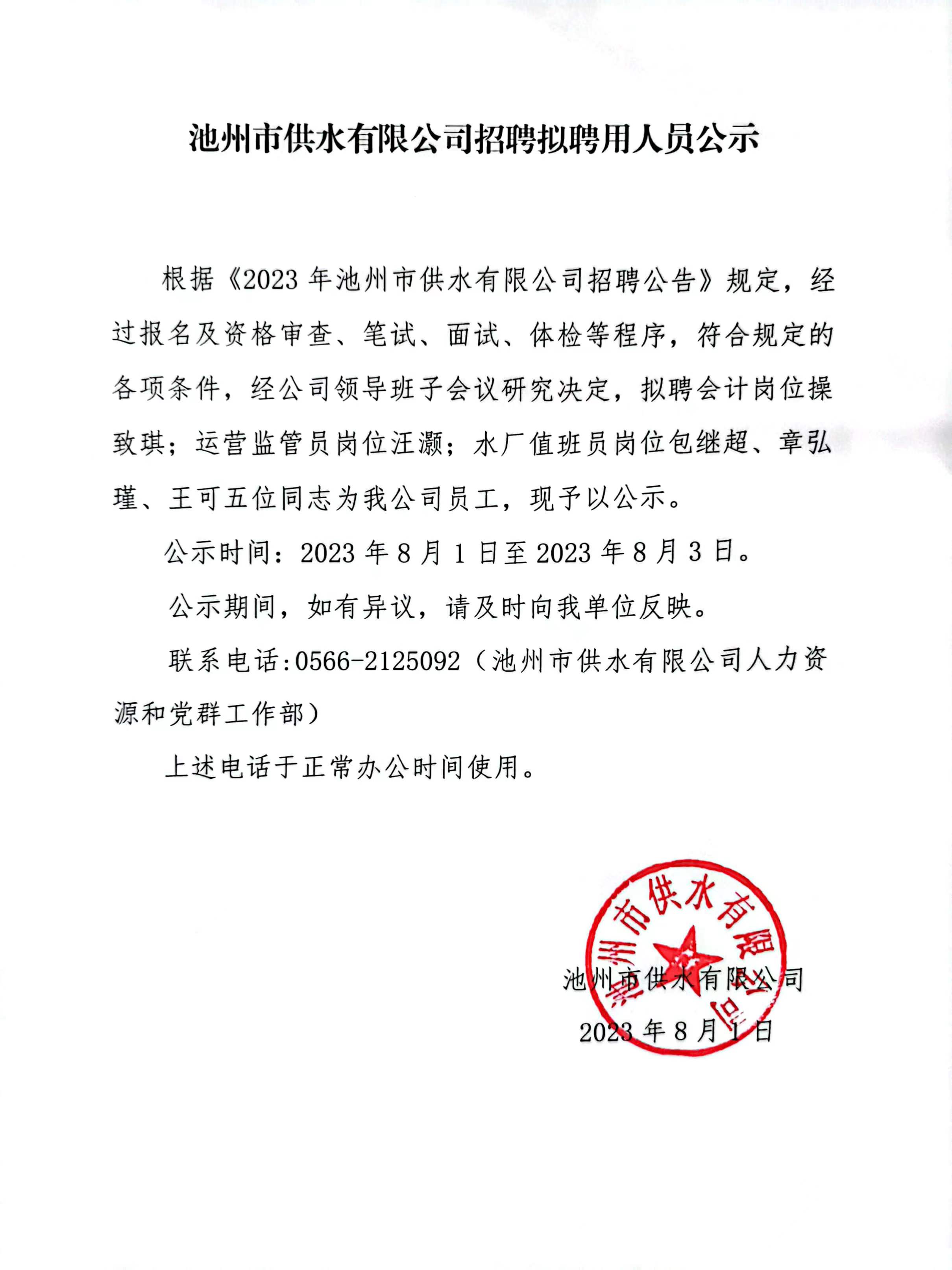 池州市供水有限公司招聘擬聘用人員公示 | |