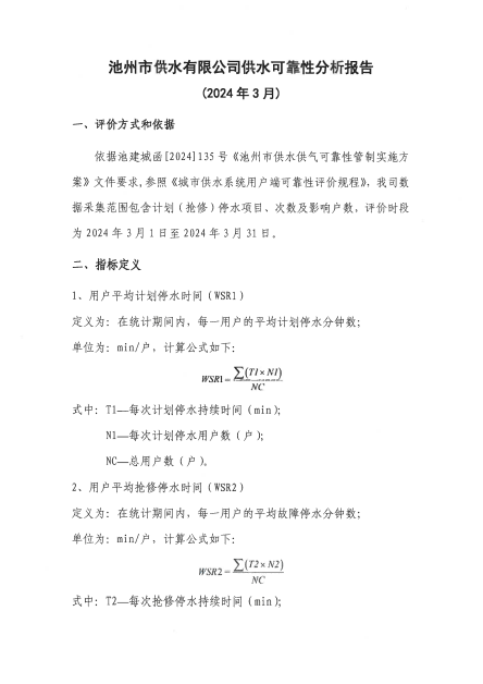 池州市供水有限公司供水可靠性分析報(bào)告 | |