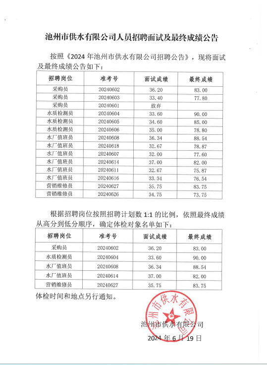 池州市供水有限公司人員招聘面試及最終成績公告 | |