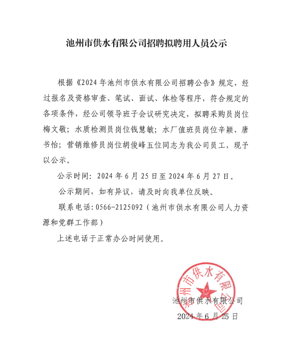 池州市供水有限公司招聘擬聘用人員公示 | |
