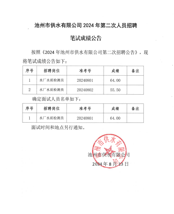 池州市供水有限公司2024年第二次招聘筆試成績公告 | |