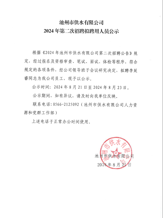 池州市供水有限公司2024年第二次招聘擬聘用人員公示 | |