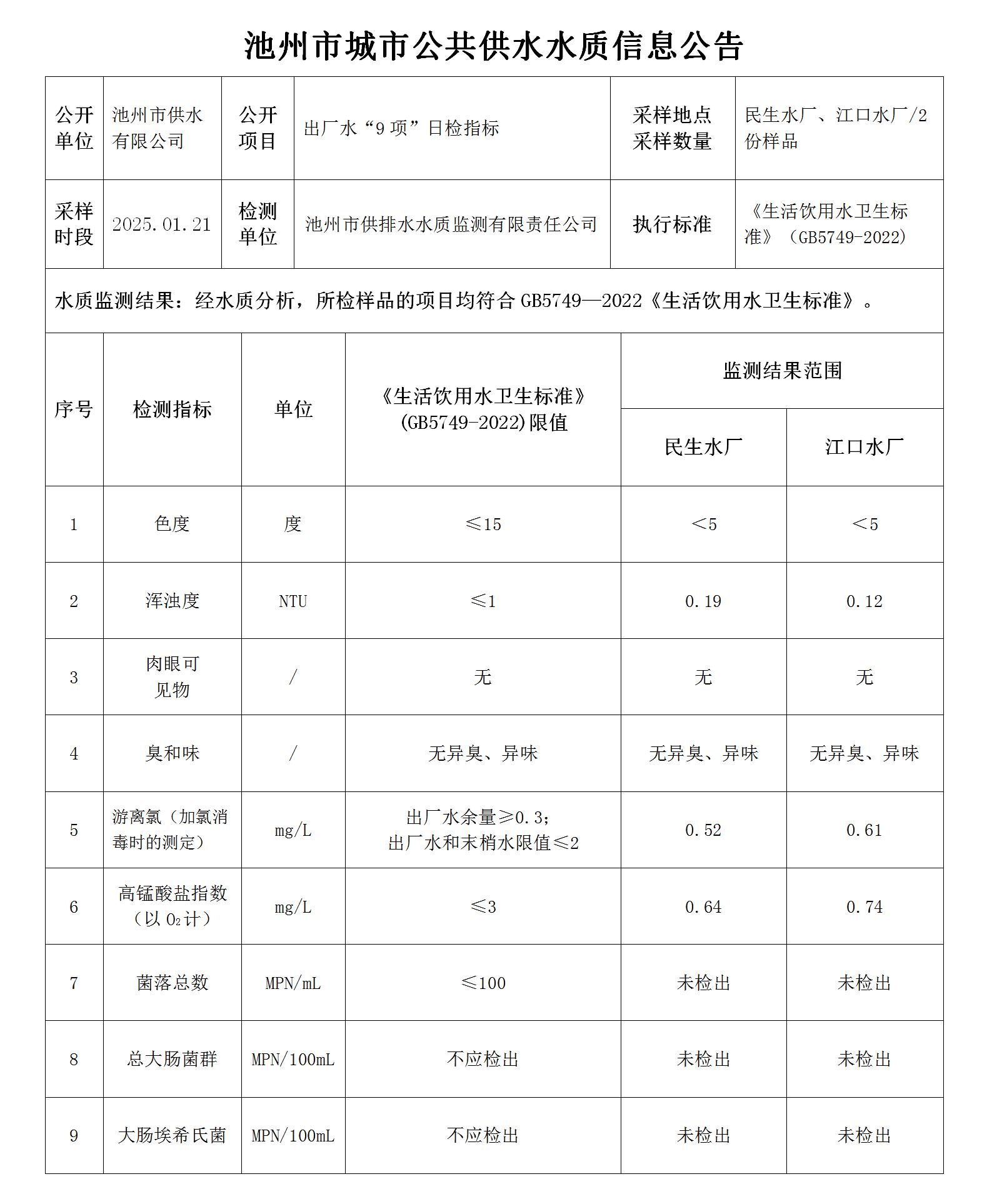 池州市城市公共供水水質(zhì)信息公告出廠水“9項”日檢指標(biāo)2025.01.21 | |