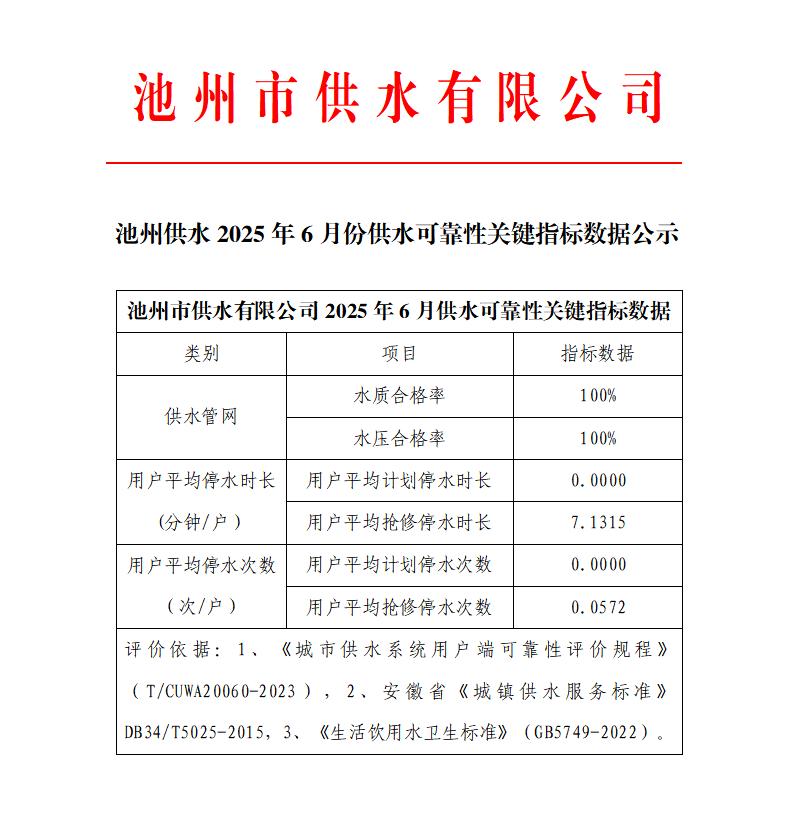 池州供水2025年6月份供水可靠性關鍵指標數據公示 | |