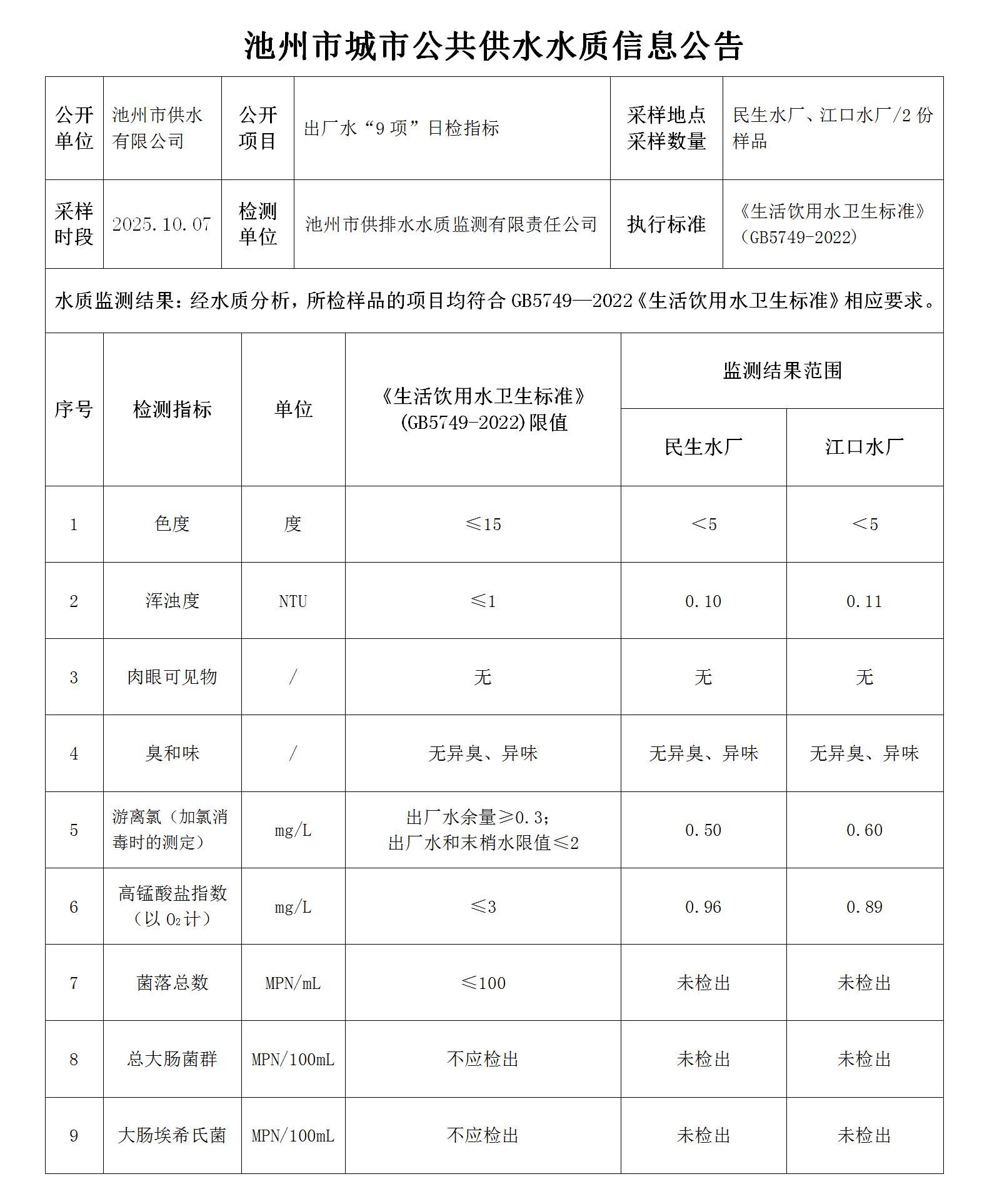池州市城市公共供水水質信息公告出廠水“9項”日檢指標20251007 | |