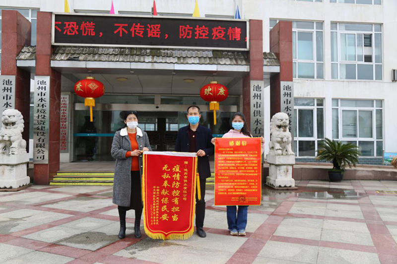 2020年3月13日上午,池州市供水有限公司大院里迎來一批特殊的客人,他們是中共池州市經(jīng)開區(qū)平天湖社區(qū)支委會(huì)、居委會(huì)的工作人員,在支部書記胡桂珍書記的帶領(lǐng)下,向池州供水公司贈(zèng)送錦旗和感謝信的。供水公司董事長(zhǎng)、支部書記楊觀樂,總經(jīng)理李張兵等領(lǐng)導(dǎo)熱情洋溢地接待了他們。