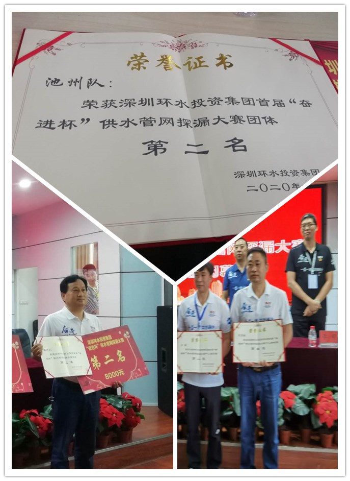 大賽剛好趕上大雨天氣,嘈雜的雨聲給探漏工作造成了嚴(yán)重干擾。其間,來(lái)自江西、安徽、浙江、廣 東、山東等地的探漏高手使出各自的看家本領(lǐng),在雨點(diǎn)的伴奏和夜色的掩映下穿梭于大街小巷,凝神靜聽(tīng),專(zhuān)注探查供水生命線上的每一個(gè)“疾患”,池州供水代表隊(duì)歷經(jīng)四天探漏比賽,摘得本次大賽的團(tuán)隊(duì)賽第二名,來(lái)自池州供水管網(wǎng)部的尤勇勝在個(gè)人精英賽中榮獲第四名的好成績(jī)。本次大賽展現(xiàn)了深圳環(huán)水投資集團(tuán)體系內(nèi)管網(wǎng)探漏的最高水準(zhǔn)。