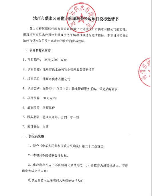 池州市供水有限公司物業(yè)管理服務(wù)采購(gòu)項(xiàng)目投標(biāo)邀請(qǐng)書(shū) | |