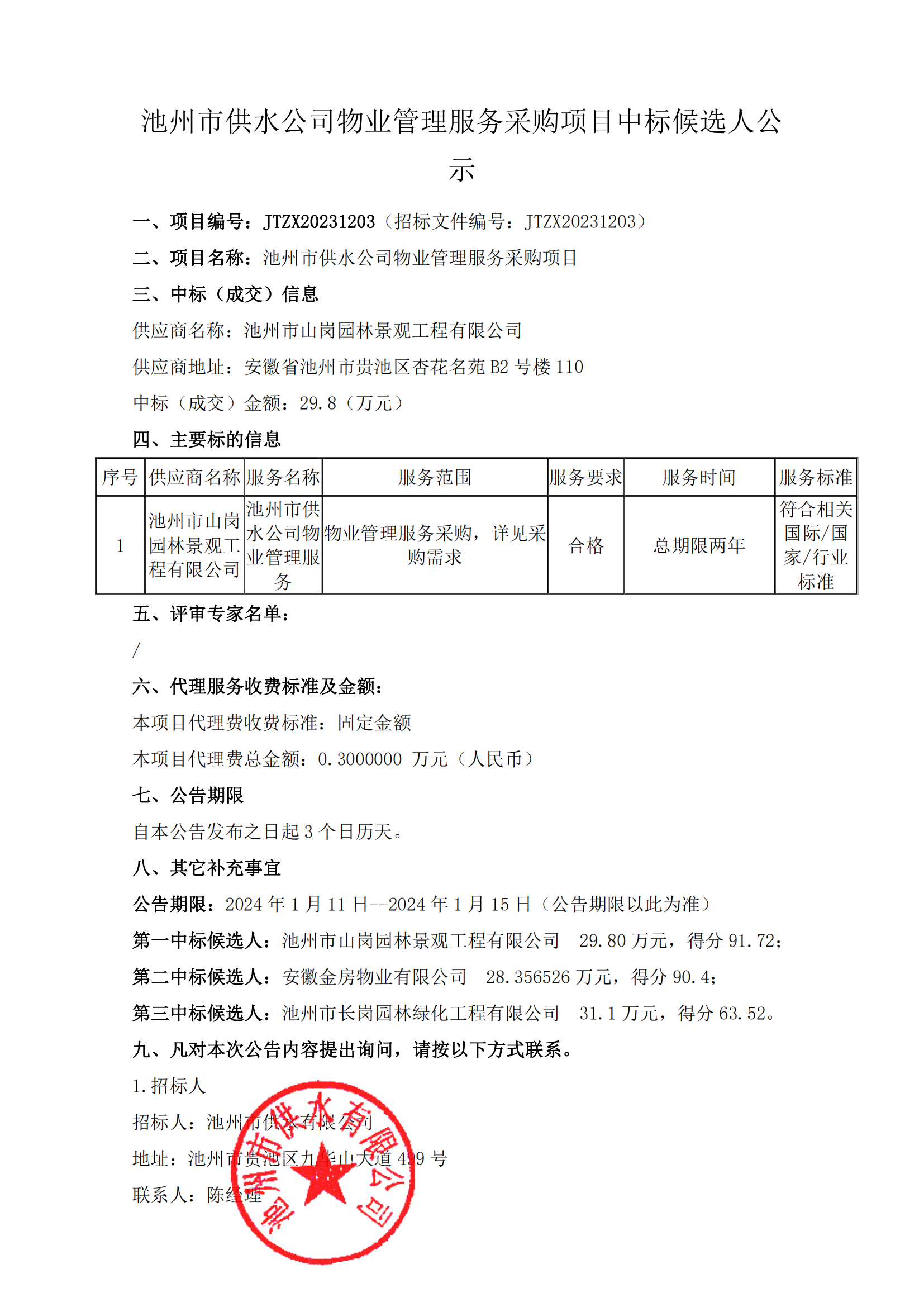 池州市供水公司物業(yè)管理服務(wù)采購項(xiàng)目中標(biāo)候選人公示 | |