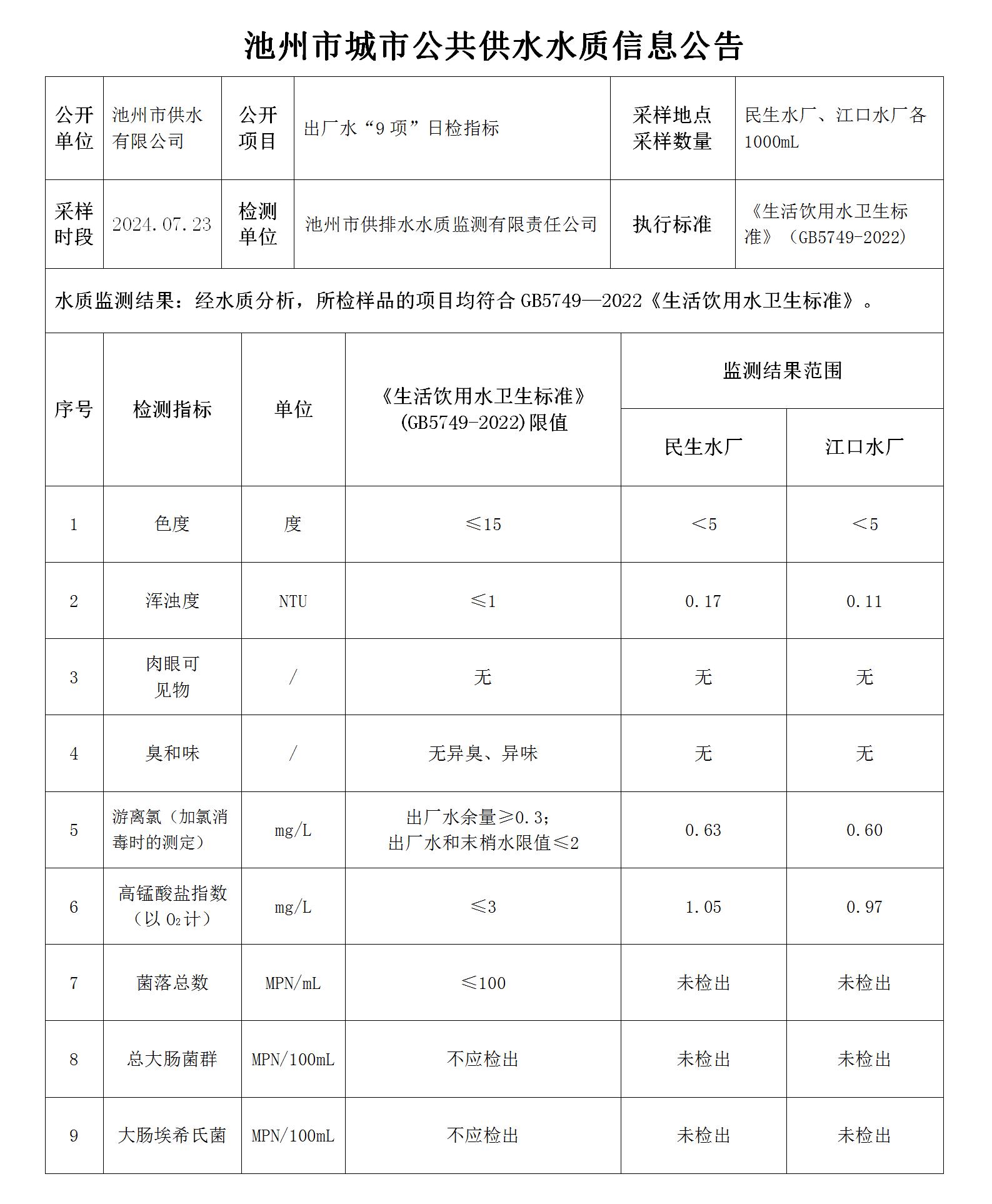 池州市城市公共供水水質信息公告出廠水“9項”日檢指標2024.07.23 | |