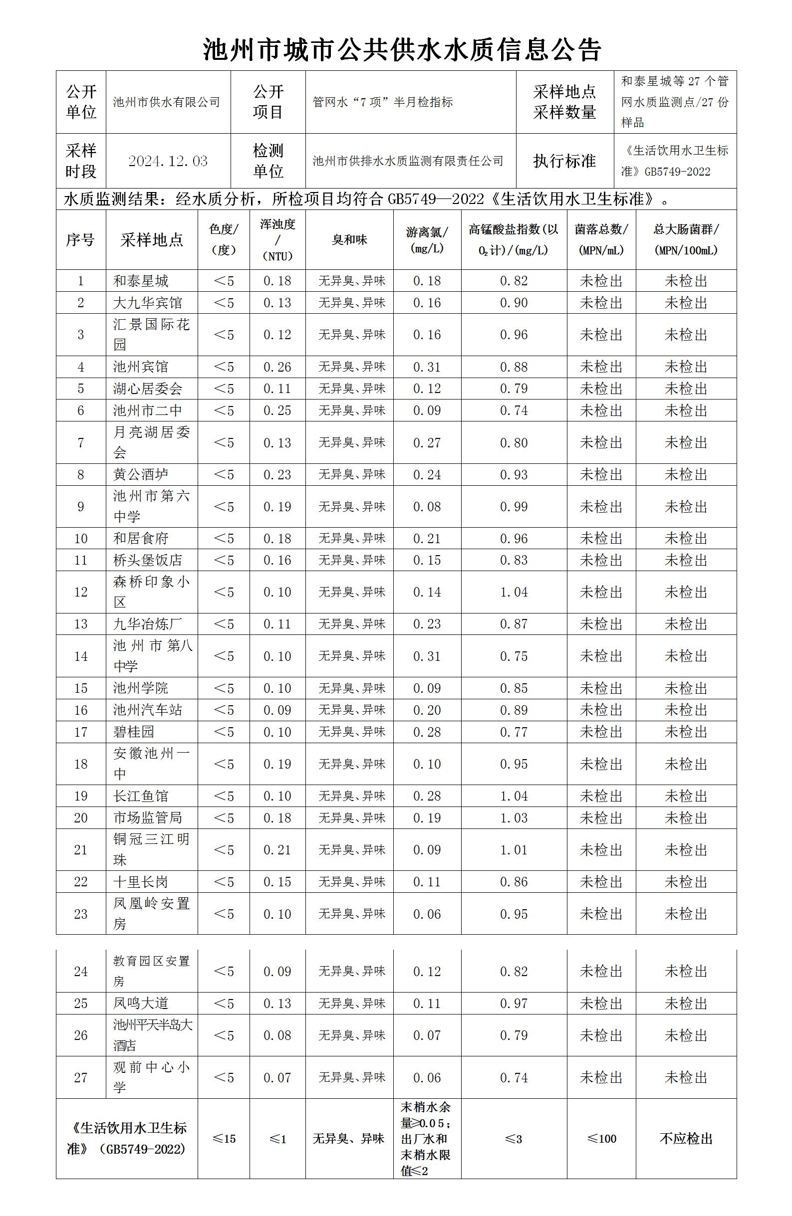 池州市城市公共供水水質(zhì)信息公告管網(wǎng)水“7項(xiàng)”半月檢指標(biāo)12-1 | |