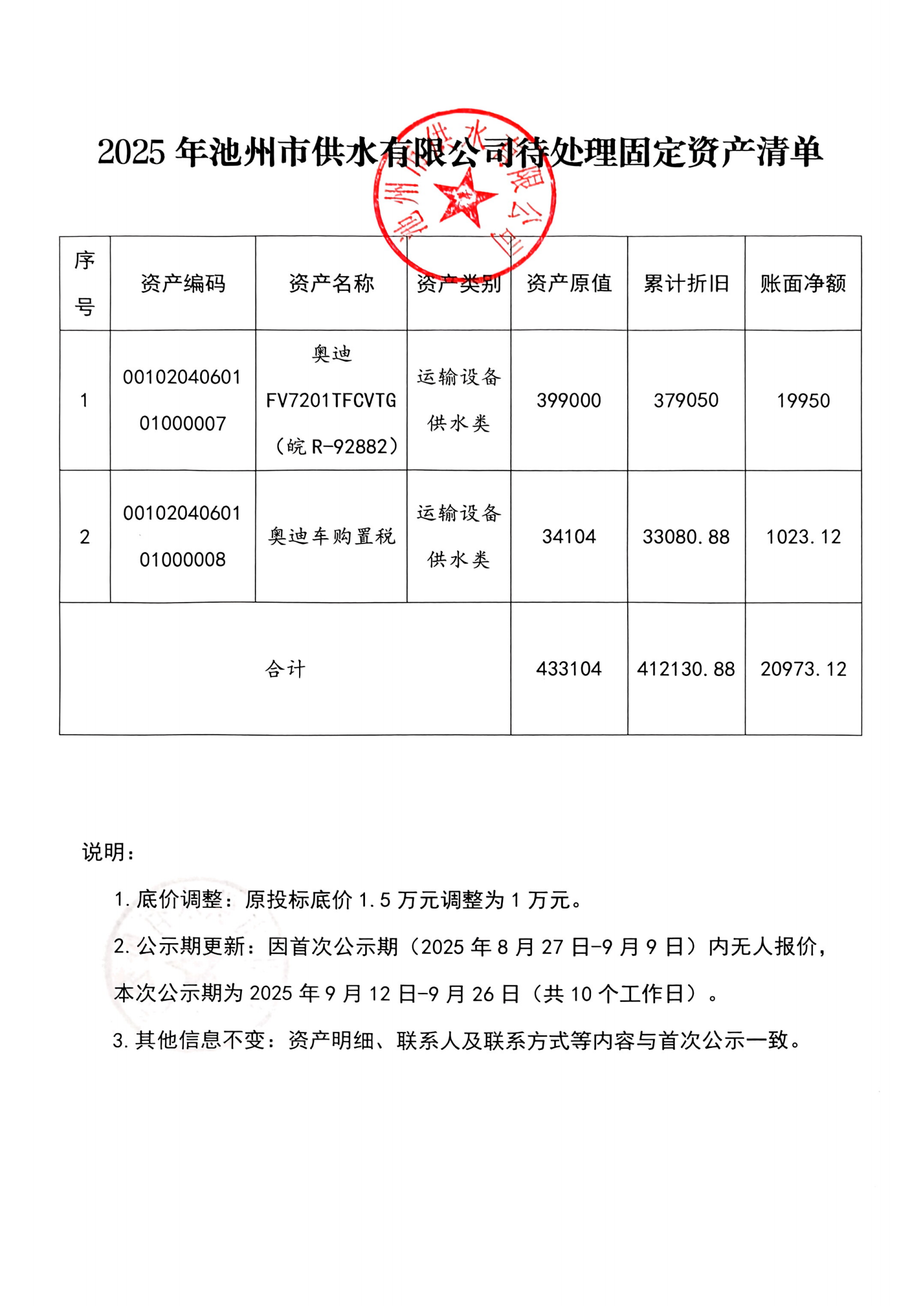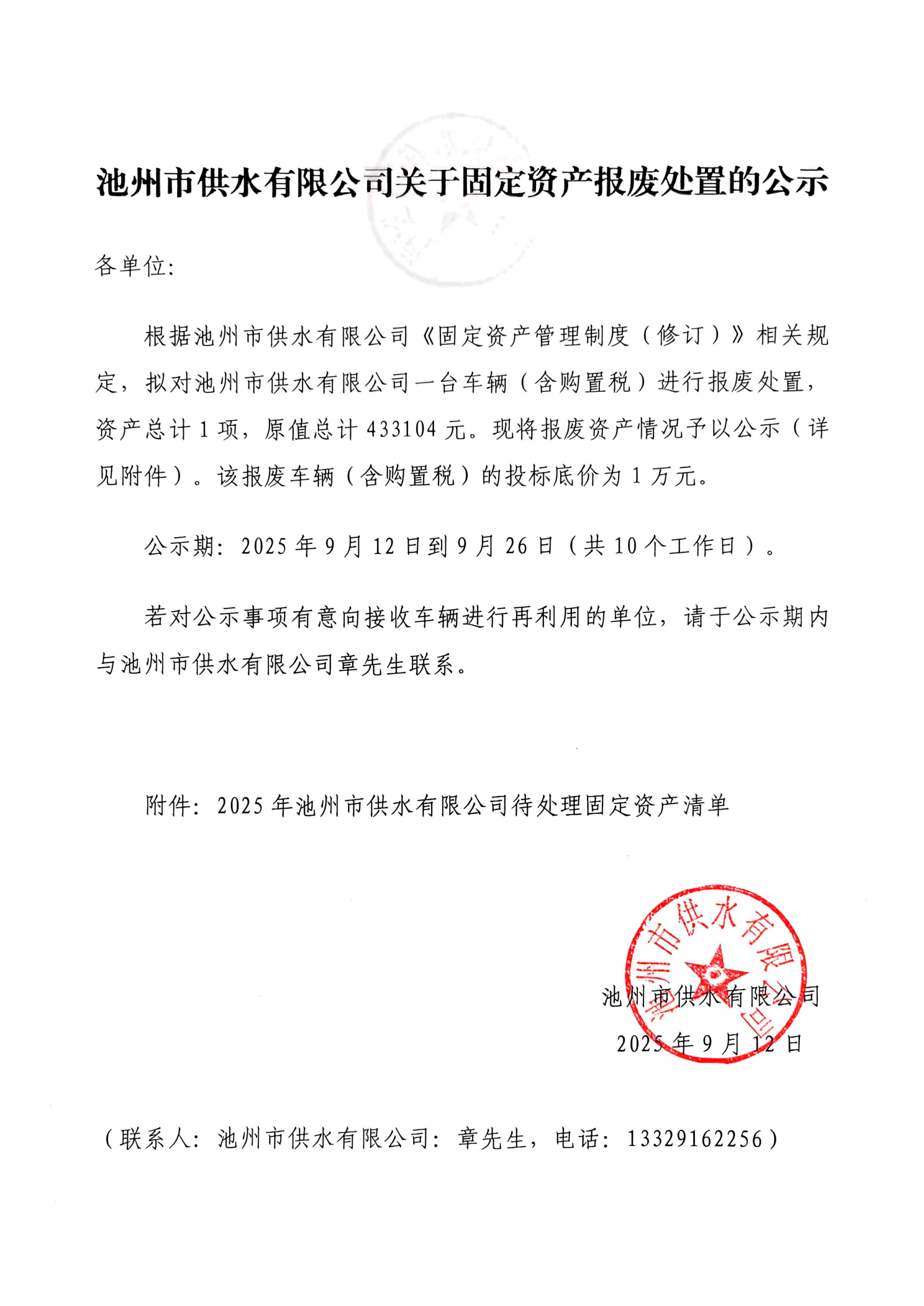 池州市供水有限公司關(guān)于固定資產(chǎn)報(bào)廢處置的公示 | |