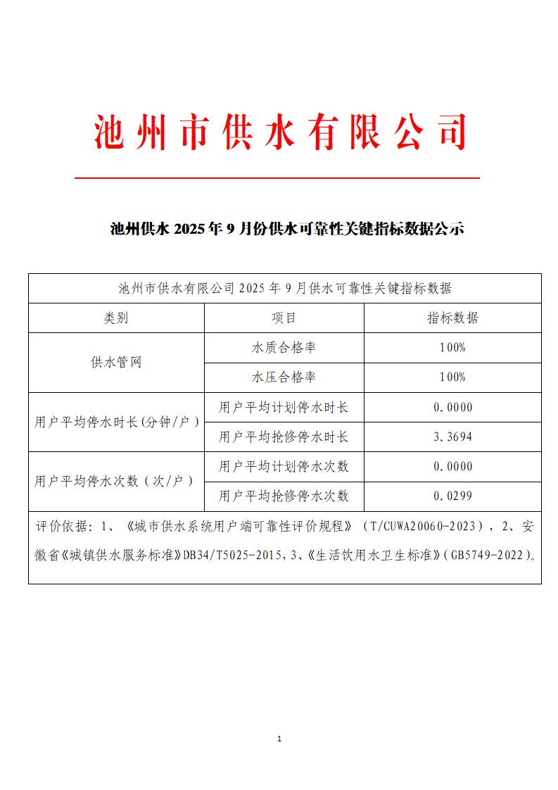 池州供水2025年9月份供水可靠性關(guān)鍵指標(biāo)數(shù)據(jù)公示 | |
